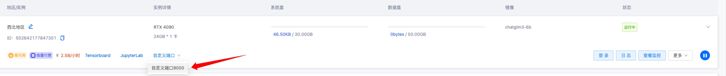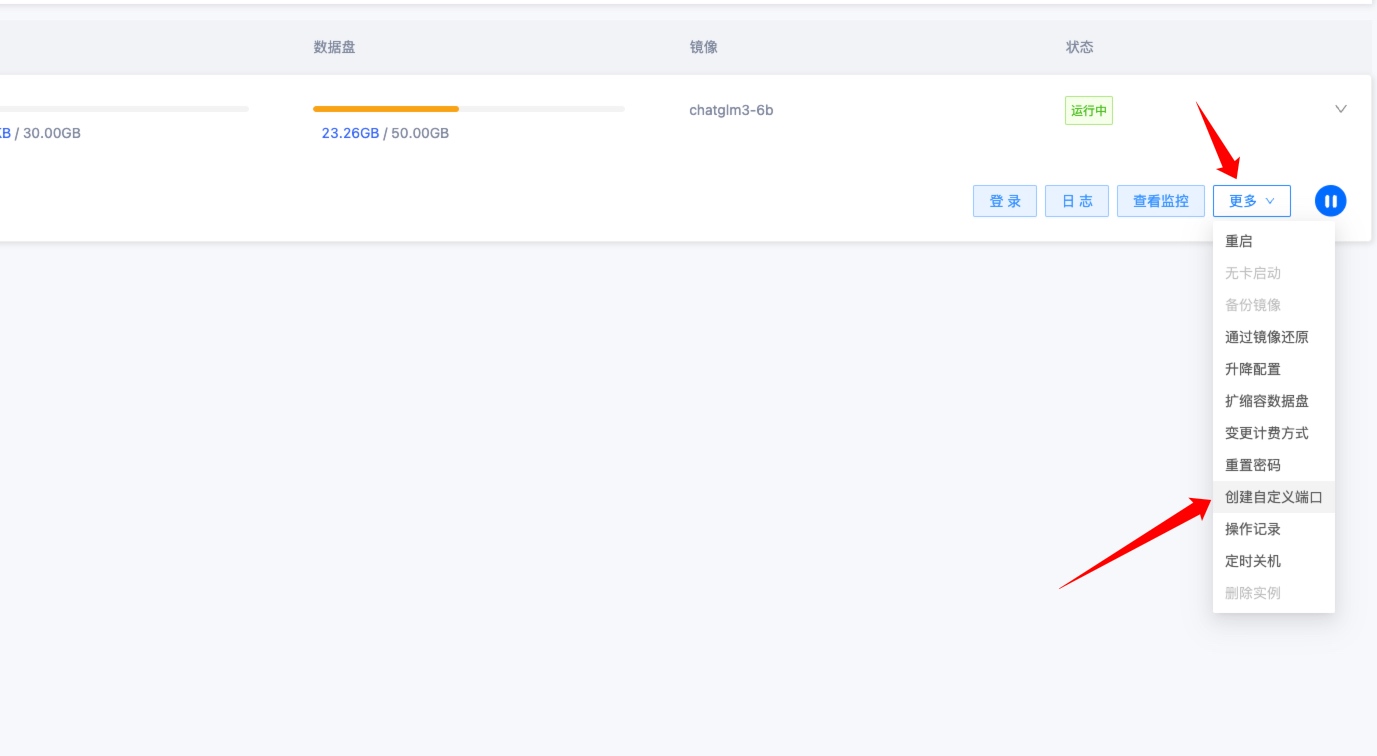 启动后到 GpuMall 实例管理控制台,点击更多——》创建自定义端口。