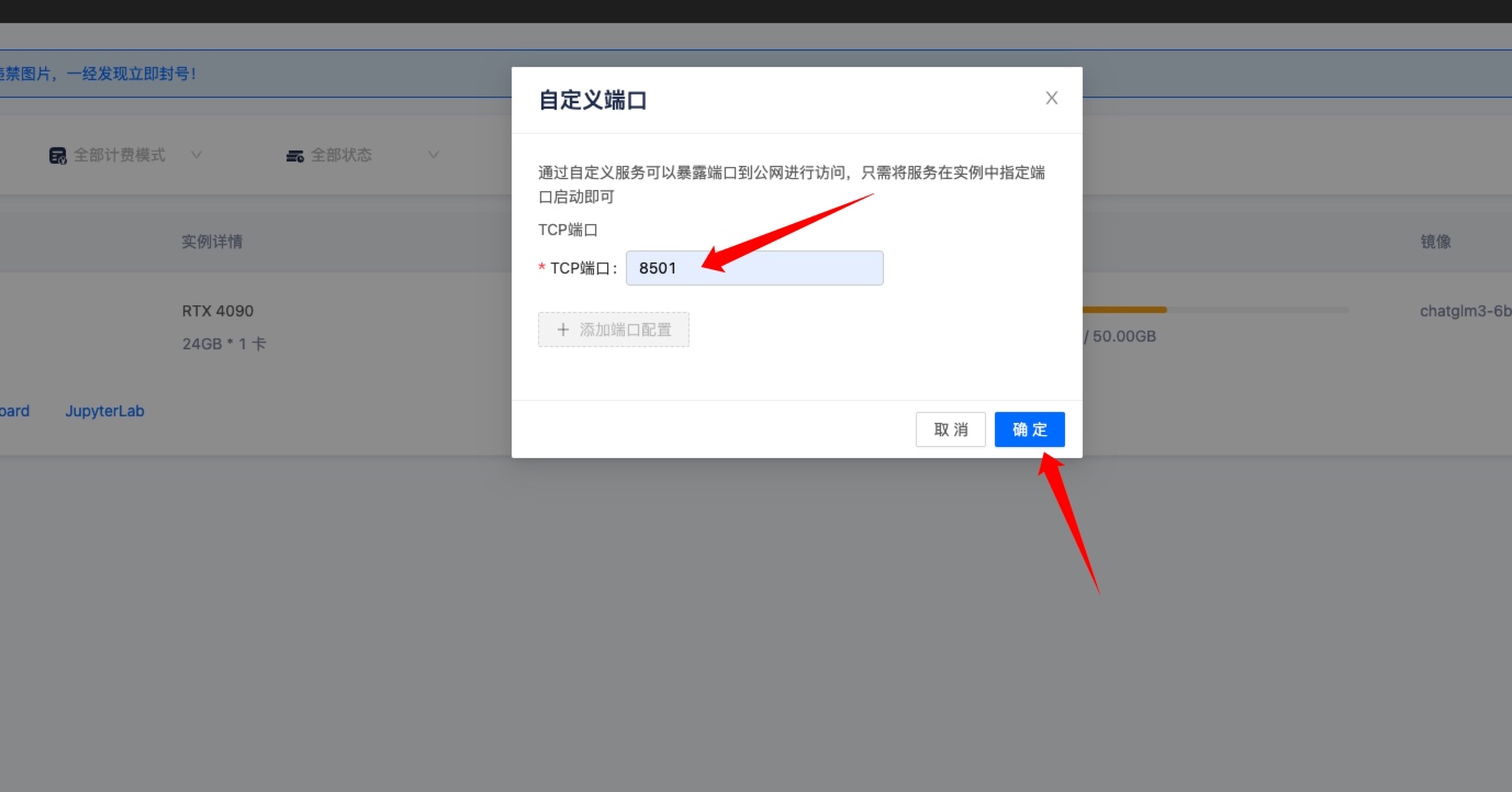 输入 8501,因为实例中的 ChatGLM3-6B 项目监听 8501 端口,然后点击确定。