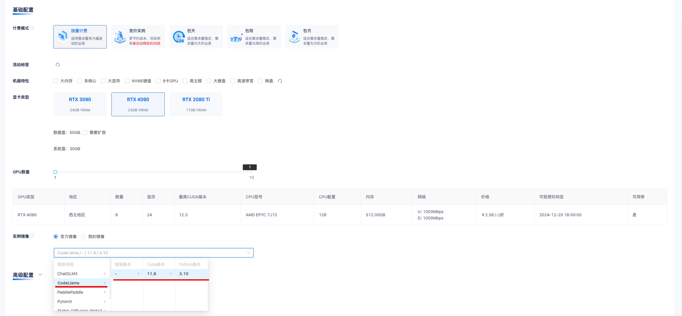 - 选择 CodeLlama 镜像创建实例