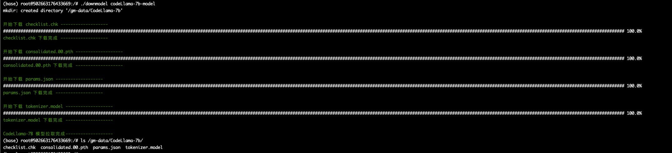 然后等待模型全部下载完成,通过上述操作拉取的模型会存储在 /gm-data/ 目录下,不建议移动,因为模型可能较大,系统盘空间不足以存储模型。