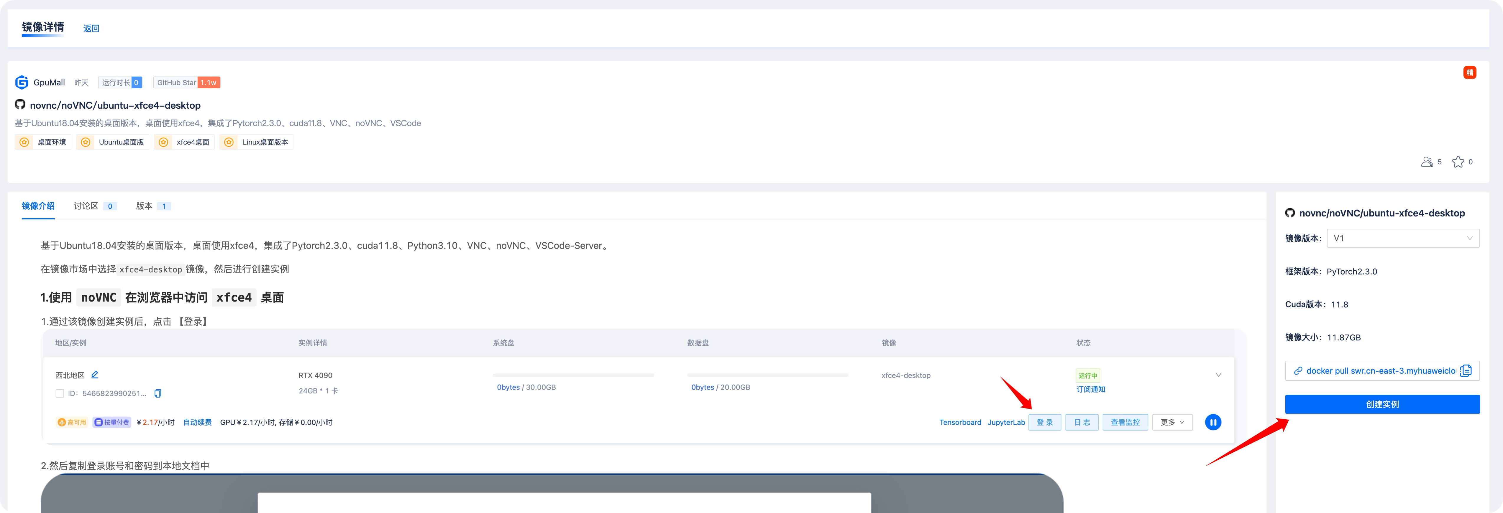 在 镜像市场 选择xfce4-desktop镜像,然后进行创建实例 #autodl#恒源云#矩池云#算力云#恒源云 实例迁移#autodl 官网#autodi#GpuMall#GPU云#AutoDL#AotuDL 算力云#GpuMall智算云#AI#大数据#算力租赁#大模型#深度学习#人工智能#算力变现