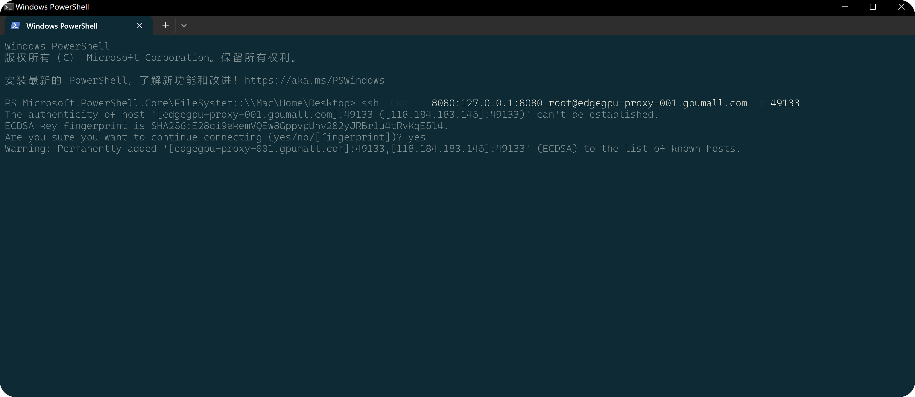 需要更换49133为您实例的ssh端口。 需要更换edgegpu-proxy-001.gpumall.com为您实例的ssh主机