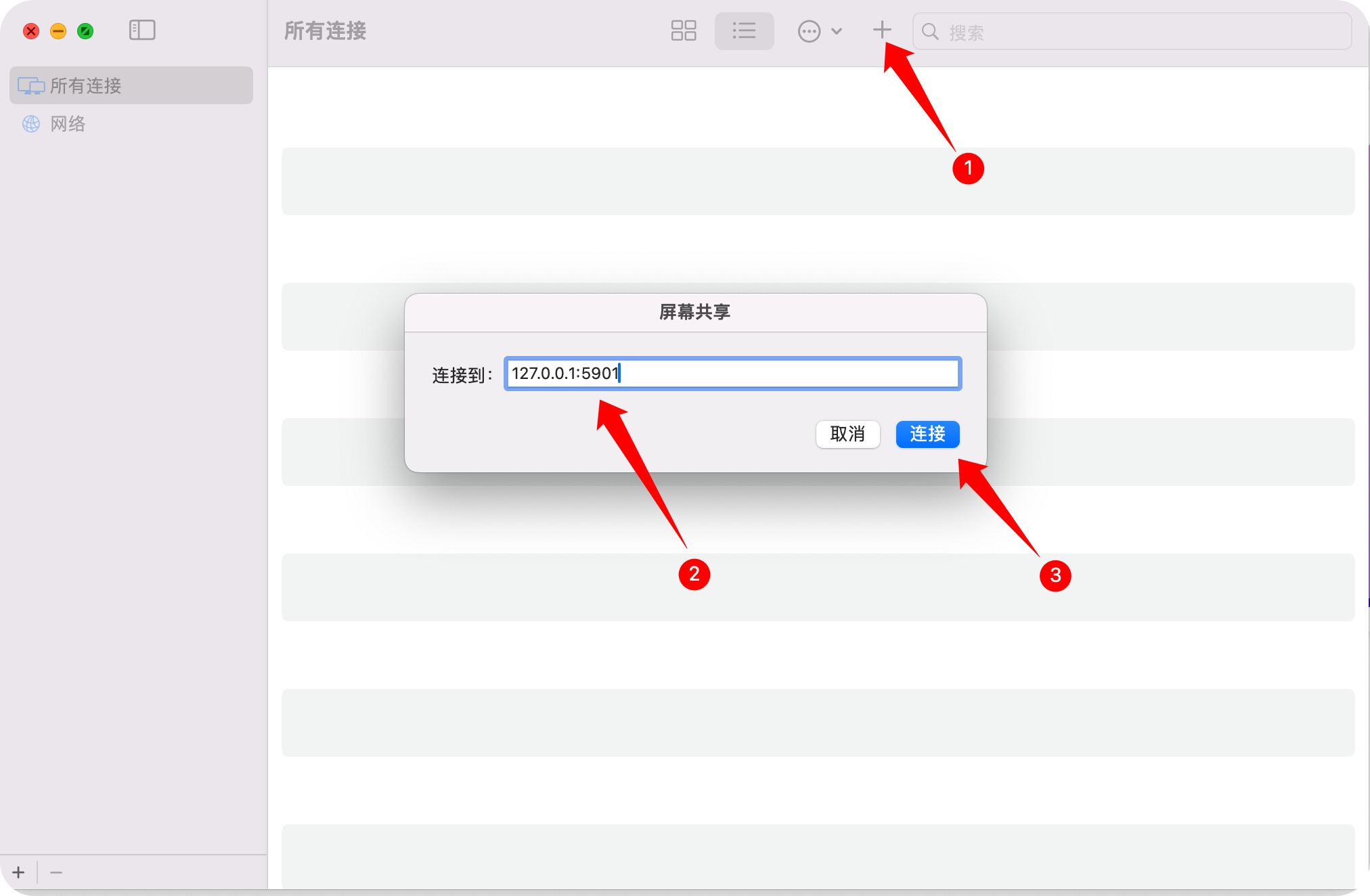 点击 + 加号,输入127.0.0.1:5901,然后点击连接