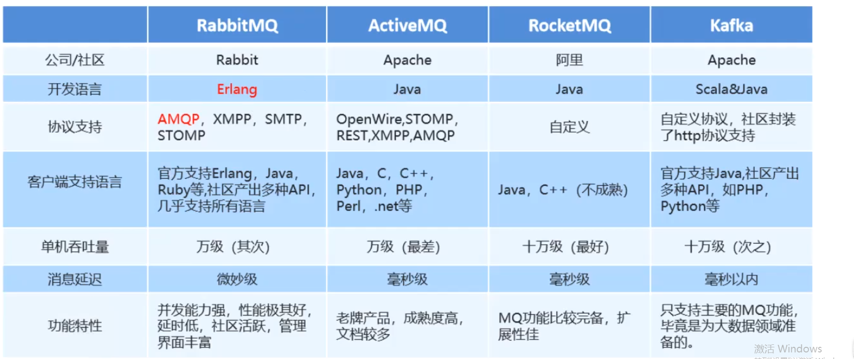 4.高并发性比较:不用想,肯定是RabbitMQ,因为RabbitMQ就是用高并发高可用的Erlang语言编写的。