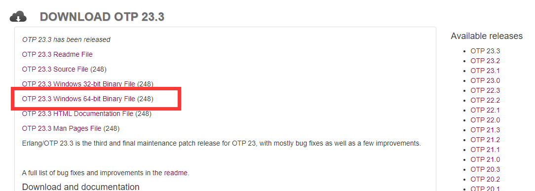 1.RabbitMQ是用erlang语言编写的,所以首先要下载erlang,下载地址:https://www.erlang.org/downloads,并安装Erlang程序运行环境:OTP 23.3 Windows 64-bit Binary File (248)/OTP 23.3 Windows 32-bit Binary File (248).根据自己电脑操作系统是32位或者64位选择下载安装。