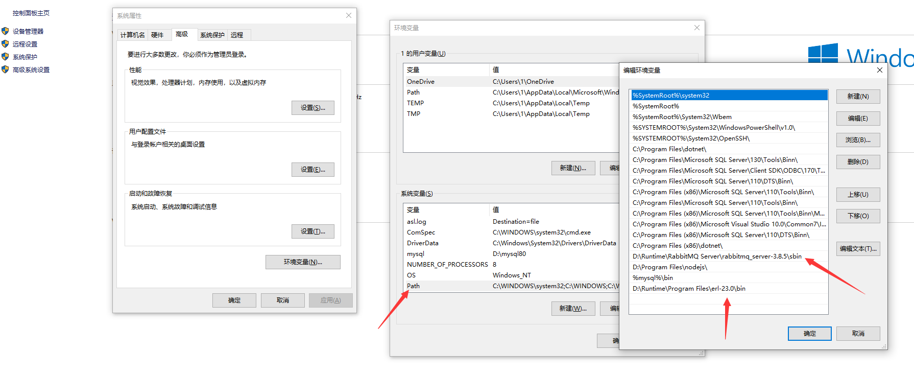 3.1.此电脑->属性->高级系统设置->环境变量->系统变量找到->path->新建,把erlang和RabbitMQ的安装地址新增进去