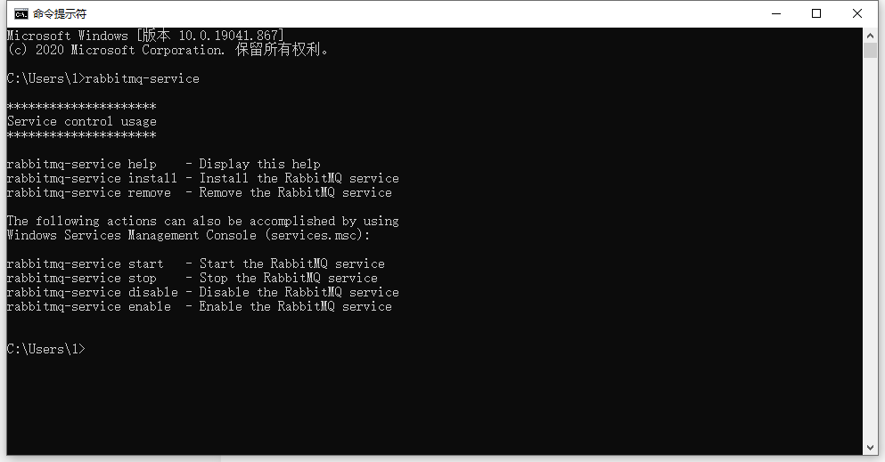 3.3.查看RabbitMQ环境变量是否设置成功,window键+R键,输入cmd,在输入Rabbitmq-service,如下图所示就表示设置成功