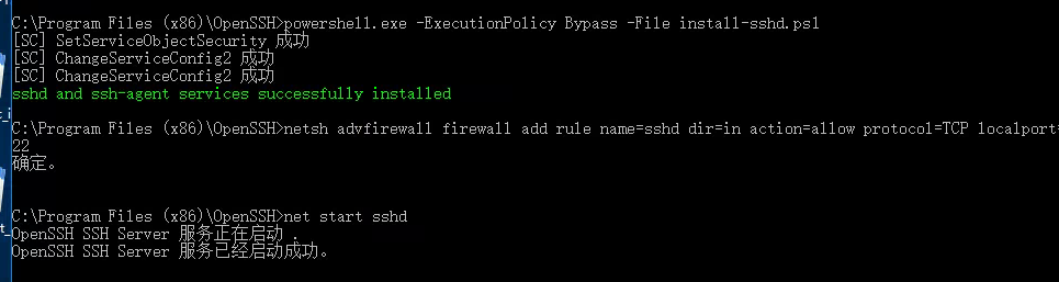 powershell.exe -ExecutionPolicy Bypass -File install-sshd.ps1 netsh advfirewall firewall add rule name=sshd dir=in action=allow protocol=TCP localport=22 net start sshd