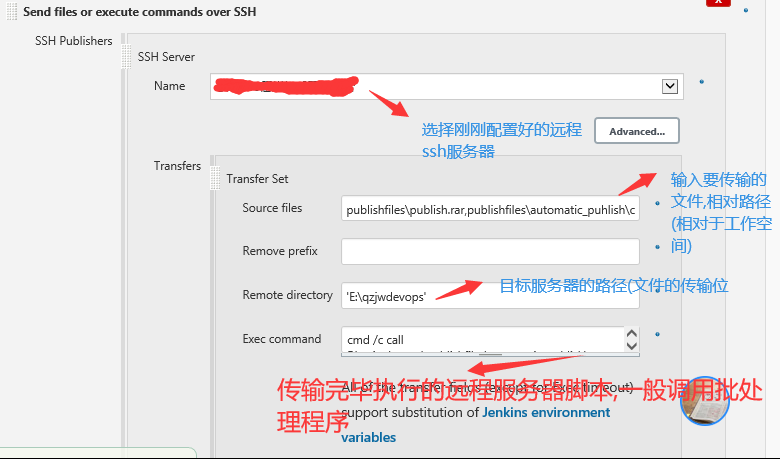 (2)、安装完成之后进入系统配置,找到Publish Over SSH配置模块,进行相关配置.具体配置参数如下: