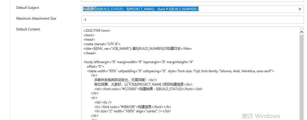 <!DOCTYPE html> <html> <head> <meta charset="UTF-8"> <title>${ENV, var="JOB_NAME"}-第${BUILD_NUMBER}次构建日志</title> </head> <body leftmargin="8" marginwidth="0" topmargin="8" marginheight="4" offset="0"> <table width="95%" cellpadding="0" cellspacing="0" style="font-size: 11pt; font-family: Tahoma, Arial, Helvetica, sans-serif"> <tr> 本邮件由系统自动发出,无需回复!<br/> 各位同事,大家好,以下为${PROJECT_NAME }项目构建信息</br> <td><font color="#CC0000">构建结果 - ${BUILD_STATUS}</font></td> </tr> <tr> <td><br /> <b><font color="#0B610B">构建信息</font></b> <hr size="2" width="100%" align="center" /></td> </tr> <tr> <td> <ul> <li>项目名称 : ${PROJECT_NAME}</li> <li>构建编号 : 第${BUILD_NUMBER}次构建</li> <li>触发原因: ${CAUSE}</li> <li>构建状态: ${BUILD_STATUS}</li> <li>构建日志: <a href="${BUILD_URL}console">${BUILD_URL}console</a></li> <li>构建 Url : <a href="${BUILD_URL}">${BUILD_URL}</a></li> <li>工作目录 : <a href="${PROJECT_URL}ws">${PROJECT_URL}ws</a></li> <li>项目 Url : <a href="${PROJECT_URL}">${PROJECT_URL}</a></li> </ul> <h4><font color="#0B610B">失败用例</font></h4> <hr size="2" width="100%" /> $FAILED_TESTS<br/> <h4><font color="#0B610B">最近提交(#$SVN_REVISION)</font></h4> <hr size="2" width="100%" /> <ul> ${CHANGES_SINCE_LAST_SUCCESS, reverse=true, format="%c", changesFormat="<li>%d [%a] %m</li>"} </ul> 详细提交: <a href="${PROJECT_URL}changes">${PROJECT_URL}changes</a><br/> </td> </tr> </table> </body> </html>