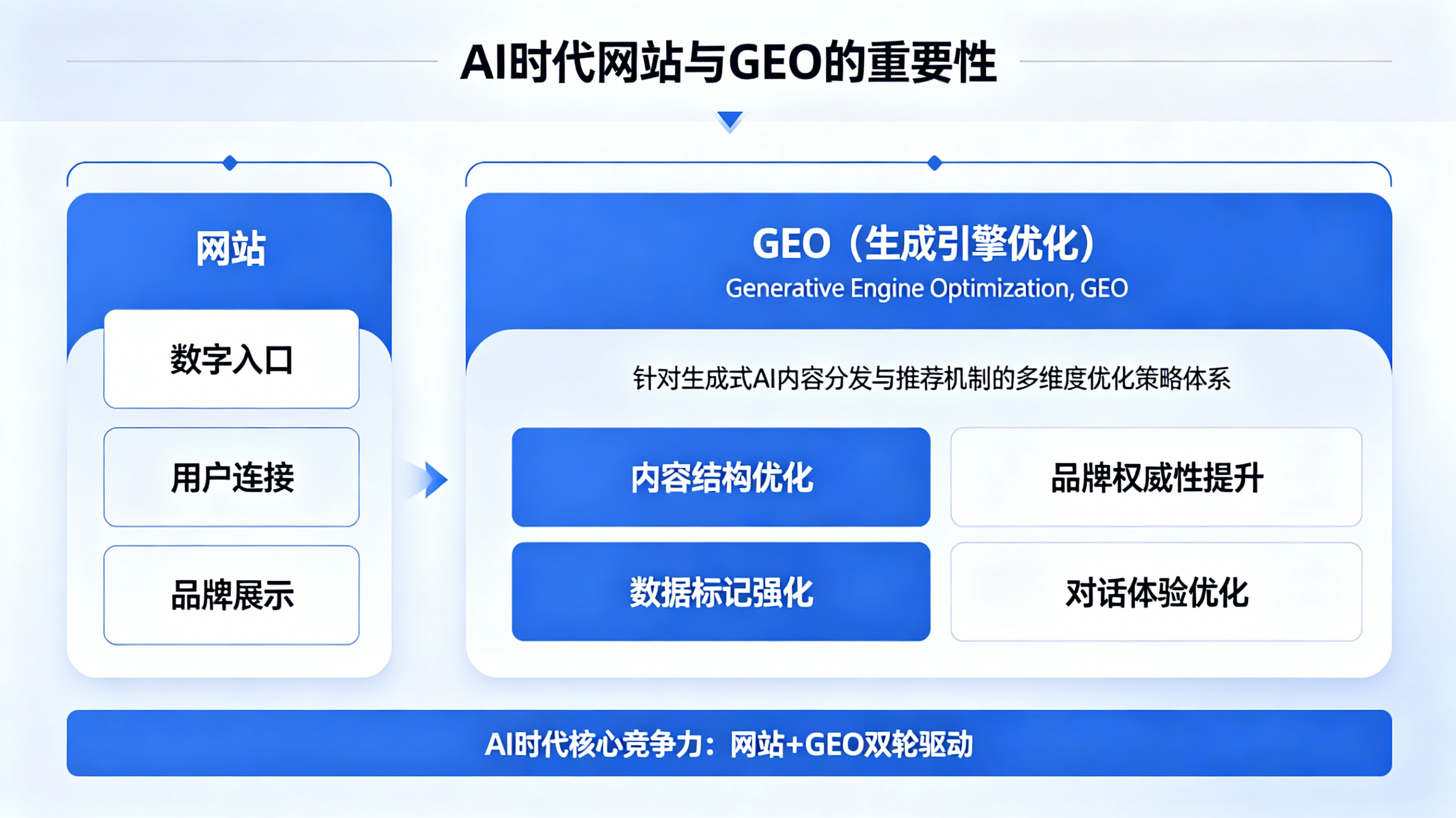 AI时代,品牌的可见度=商业的可能性,而全国性的网站建设与GEO优化,就是企业抢占全国市场的核心竞争力。没有适配AI、覆盖全网的官网与GEO布局,再优质的产品与服务,都将淹没在信息洪流中,无法触达全国意向客户。