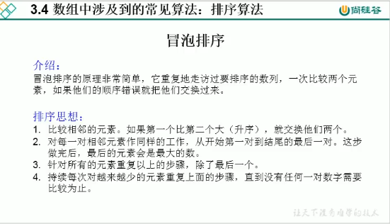 public static void main(String[] args) { int[] arr=new int[]{21,324,44,55,67,11,23,45,7,-11,3,4,44,55}; //冒泡排序 for (int i=0;i<arr.length-1;i++){ for (int j=0;j<arr.length-1-i;j++){ if (arr[j]>arr[j+1]){ int temp =arr[j]; arr[j]=arr[j+1]; arr[j+1]=temp; } } } for (int i=0;i< arr.length;i++){ System.out.print(arr[i]+" "); } }