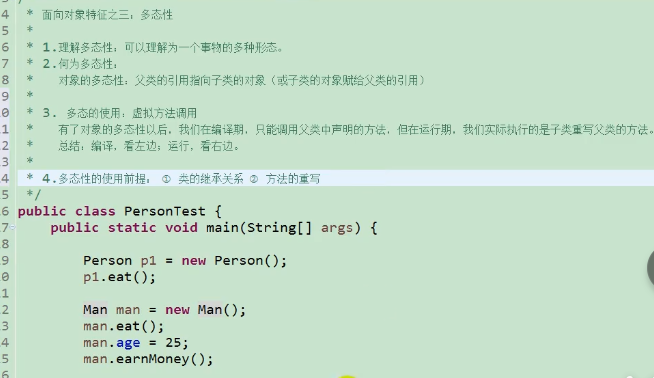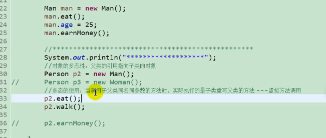 public class AnimalTest { public static void main(String[] args) { AnimalTest test =new AnimalTest(); test.func(new Cat()); test.func(new Dog()); } public void func(Animal animal){//Animal animal =new Dog(); animal.eat(); animal.shout(); } } class Animal{ public void eat(){ System.out.println("动物进食"); } public void shout(){ System.out.println("动物,叫"); } } class Dog extends Animal{ public void eat(){ System.out.println("狗吃鱼"); } public void shout(){ System.out.println("汪汪汪"); } } class Cat extends Animal{ public void eat(){ System.out.println("猫吃骨头"); } public void shout(){ System.out.println("喵喵喵"); } }