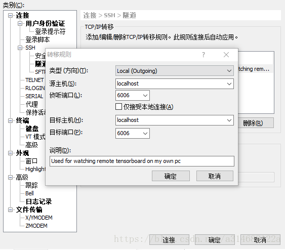 首先 隧道 在Xshell > 文件 > 属性 > 连接 > SSH > 隧道 > 添加 > 侦听端口与目标端口设置为6006