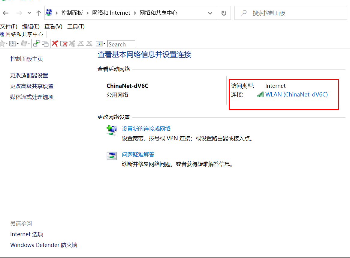 step3 : 选中网络和共享中心,进入相应的界面之后,点击连接中的所连接的WLAN;