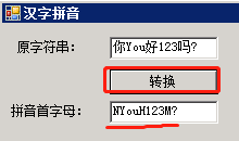 字符串(汉字、英文和数字混杂皆可)拼音首字母,用到微软的Microsoft Visual Studio International Pack的拼音功能(dll)