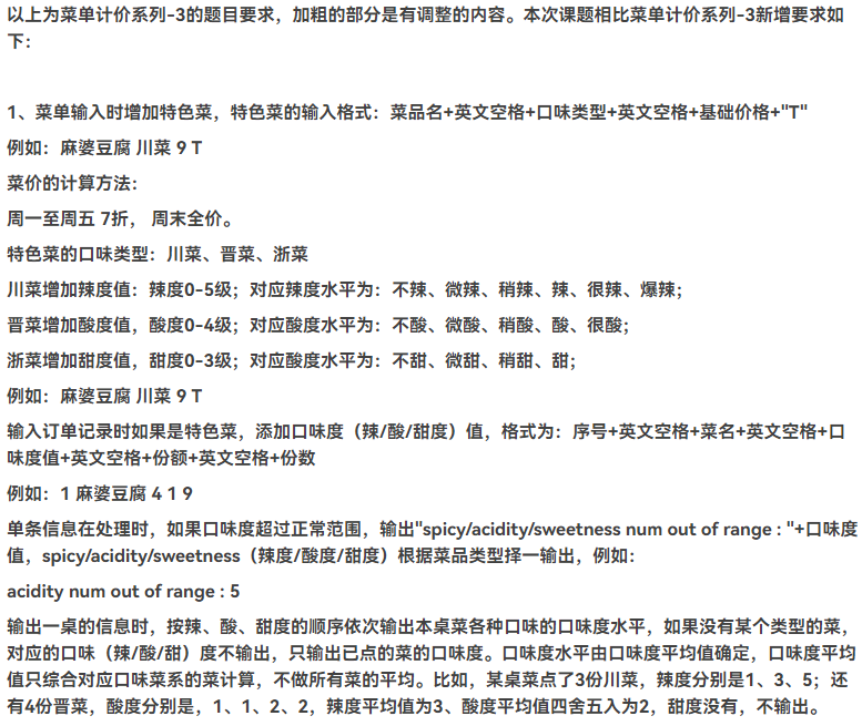 相较于第三次,增加了特色菜的功能,以及不同时间范围内不同折数的功能,在菜单计价程序-3的基础上也增加了特色菜的处理以及大量异常输入的处理,由于基础不好,这次写的代码不仅多而且功能也不完善,只能实现部分测试点。