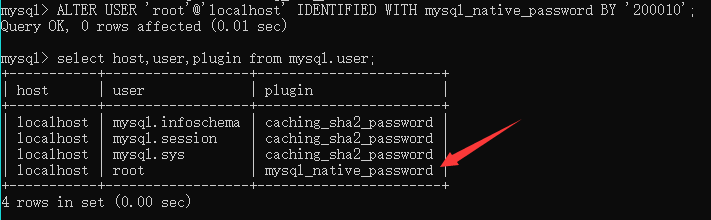 打开cmd,输入mysql -u root -p 登入mysql,输入命令: sql ALTER USER 'root'@'localhost' IDENTIFIED WITH mysql_native_password BY '200010';
