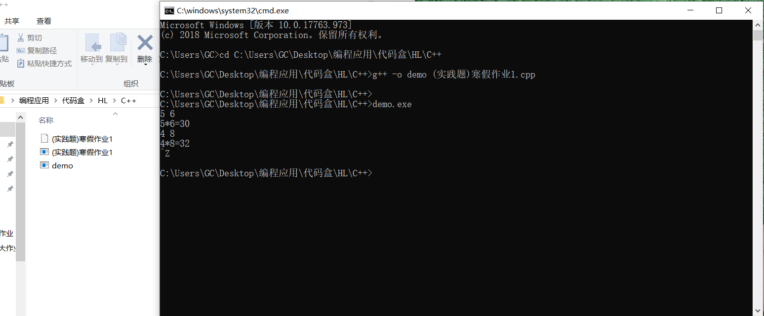 win+r 输入cmd进入命令台,输入cd+C:\Users\GC\Desktop\编程应用\代码盒\HL\C++进入对应cpp目录后输入g++ -o demo (实践题)寒假作业1.cpp 编译名称为demo.exe的文件后输入demo.cpp运行代码