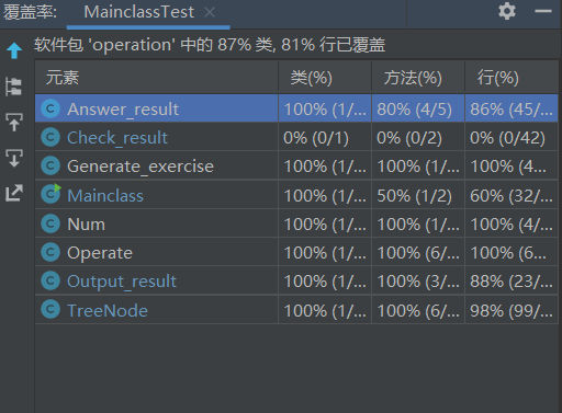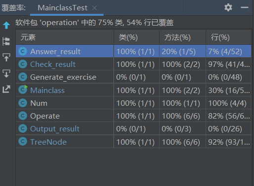 执行过程:调用Generate_exercise类进行生成题目。通过循环执行:单题目的生成,后通过二叉树数据结构TreeNode类进行计算操作得到答案结果。针对各类情况对答案进行处理。如果满足程序要求,将该回答加入到查重列表(用于题目查重的数据结构)调用Output_result类进行输出题目和答案到文件中。