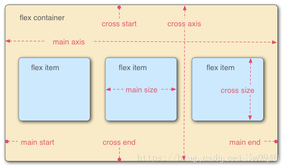 项目默认沿主轴排列。单个项目占据的主轴空间叫做main size,占据的交叉轴空间叫做
