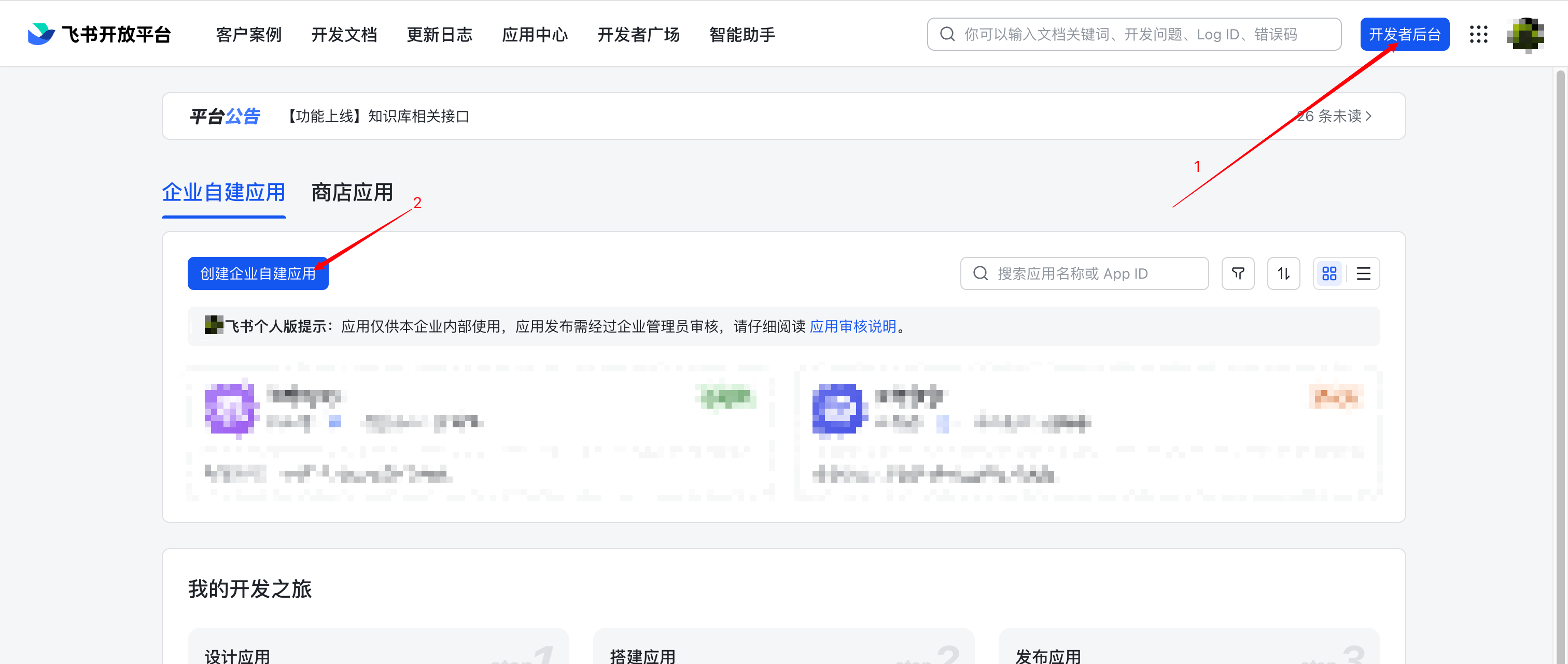 进入飞书开发者后台,【创建企业自建应用】,信息随意填写。创建完成后点击应用进入后台管理页。