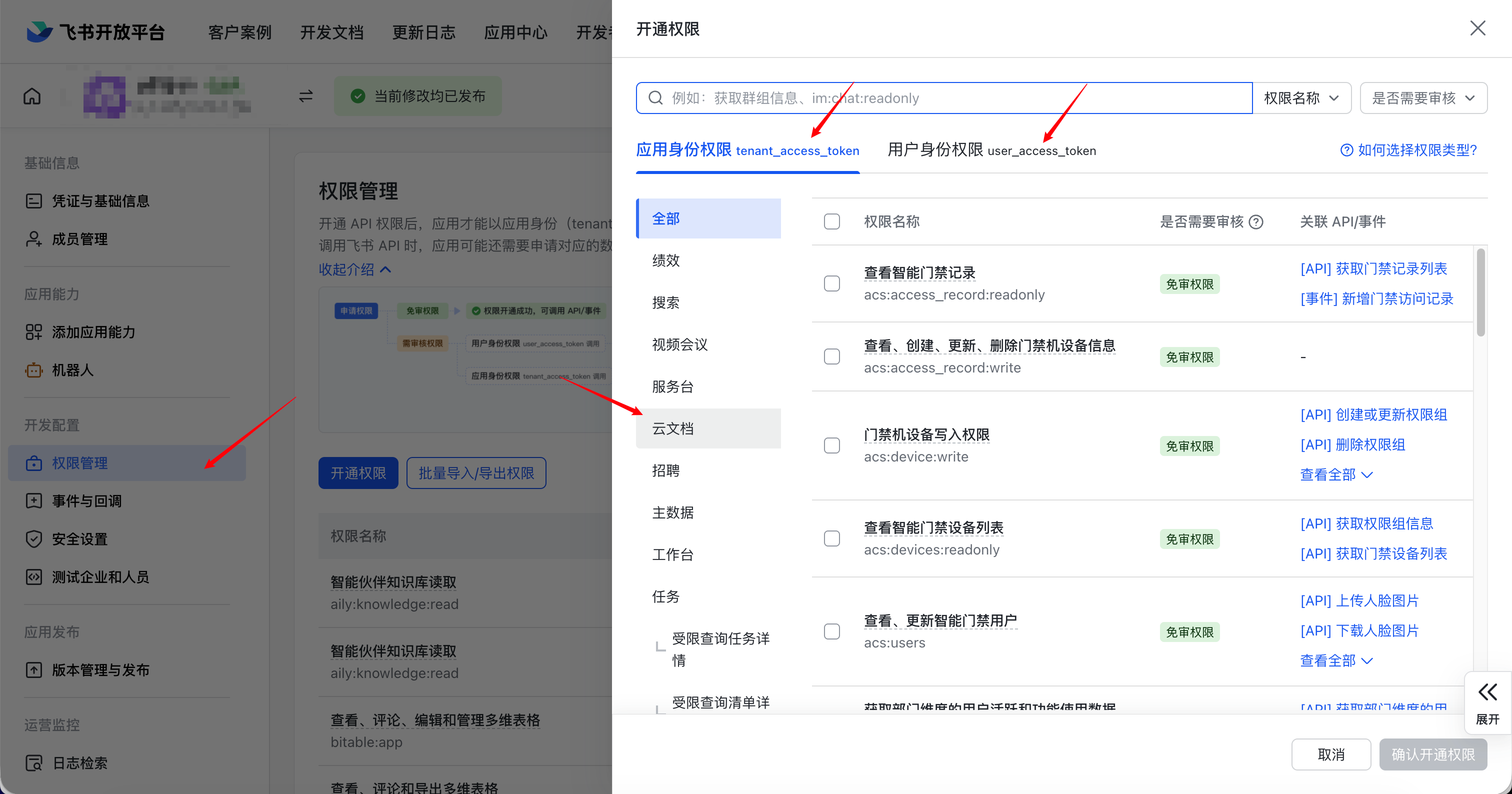 进入后台管理页后,点击【开发配置-权限管理】,开通云文档的权限,可以搜索云文档,全部勾选,【确认开通权限】。