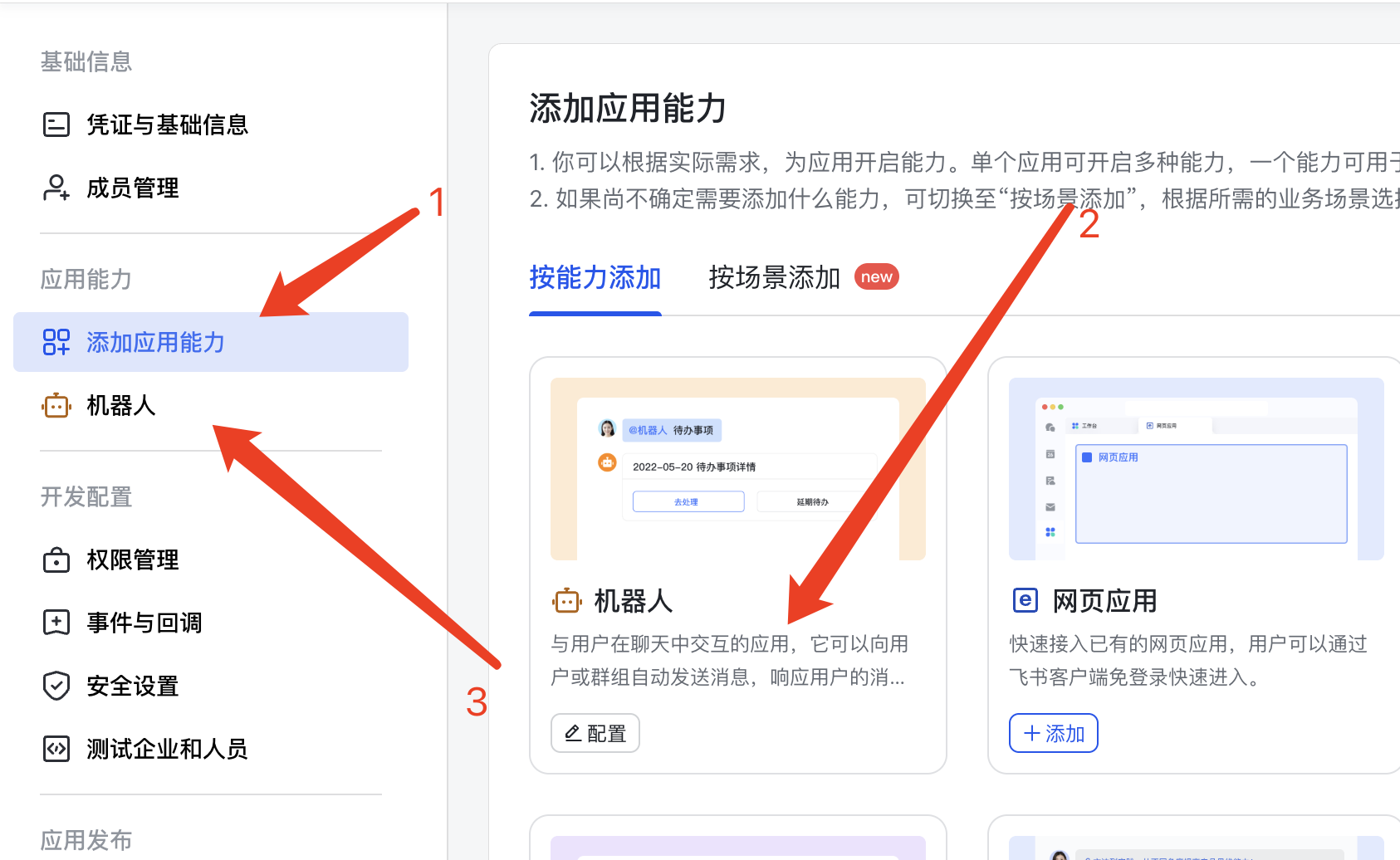 在后台管理页后,点击【添加应用能力】-【按能力添加】-添加机器人。