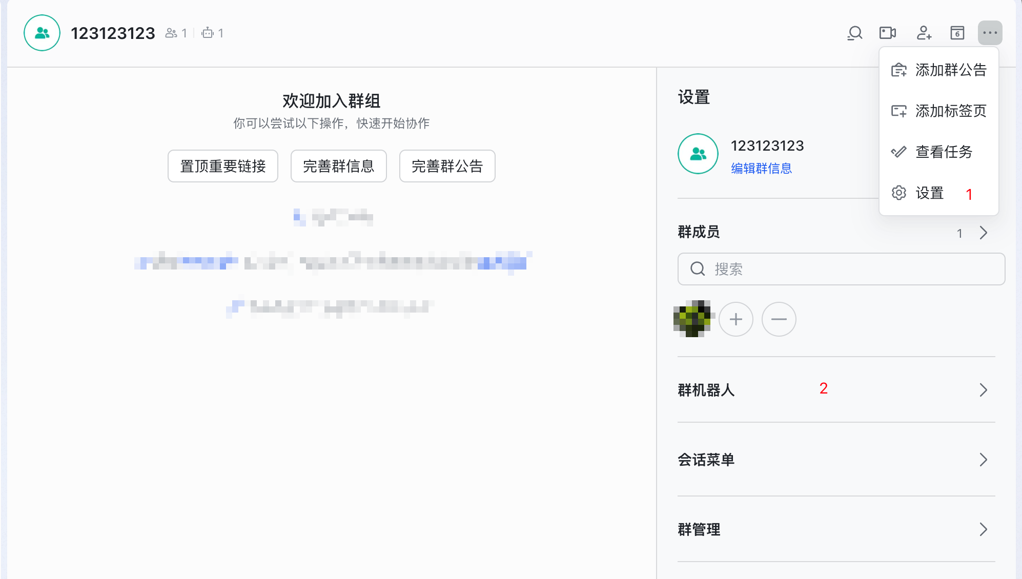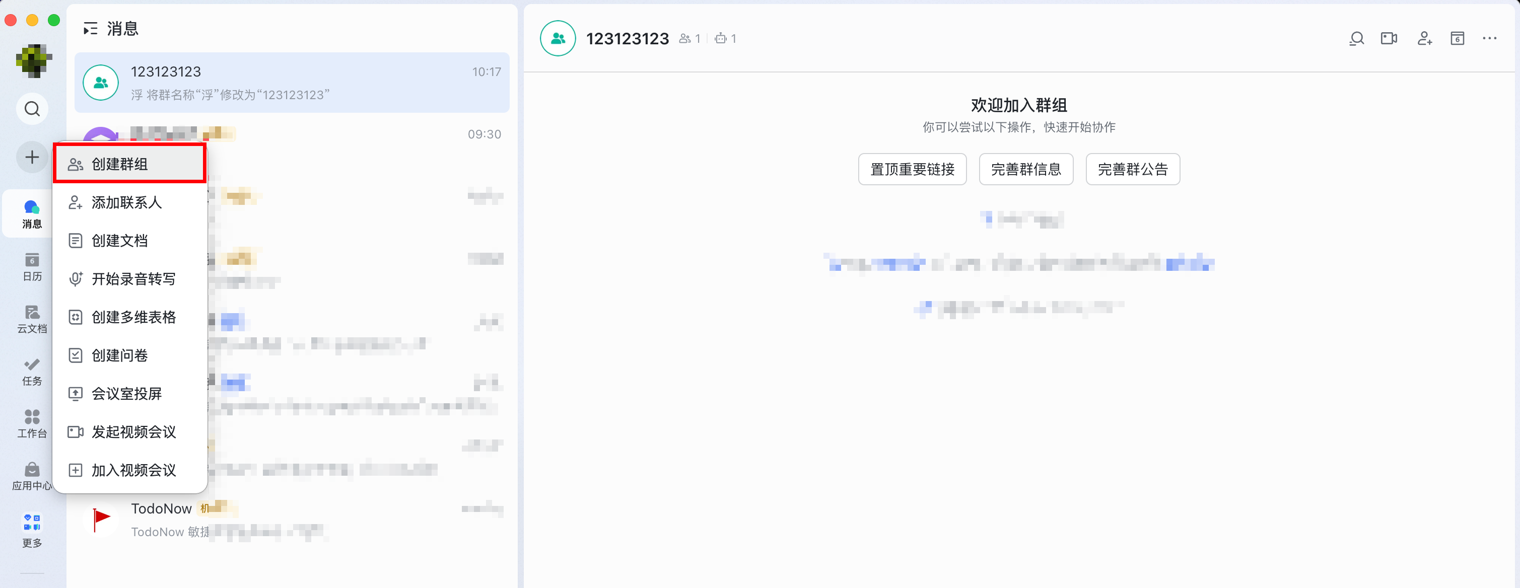 - 在飞书桌面客户端中创建一个新的群组或直接使用已有的群组