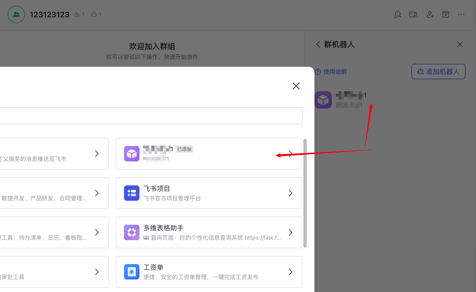 - 为群组添加群机器人,选择上面步骤中自己创建的应用作为群机器人