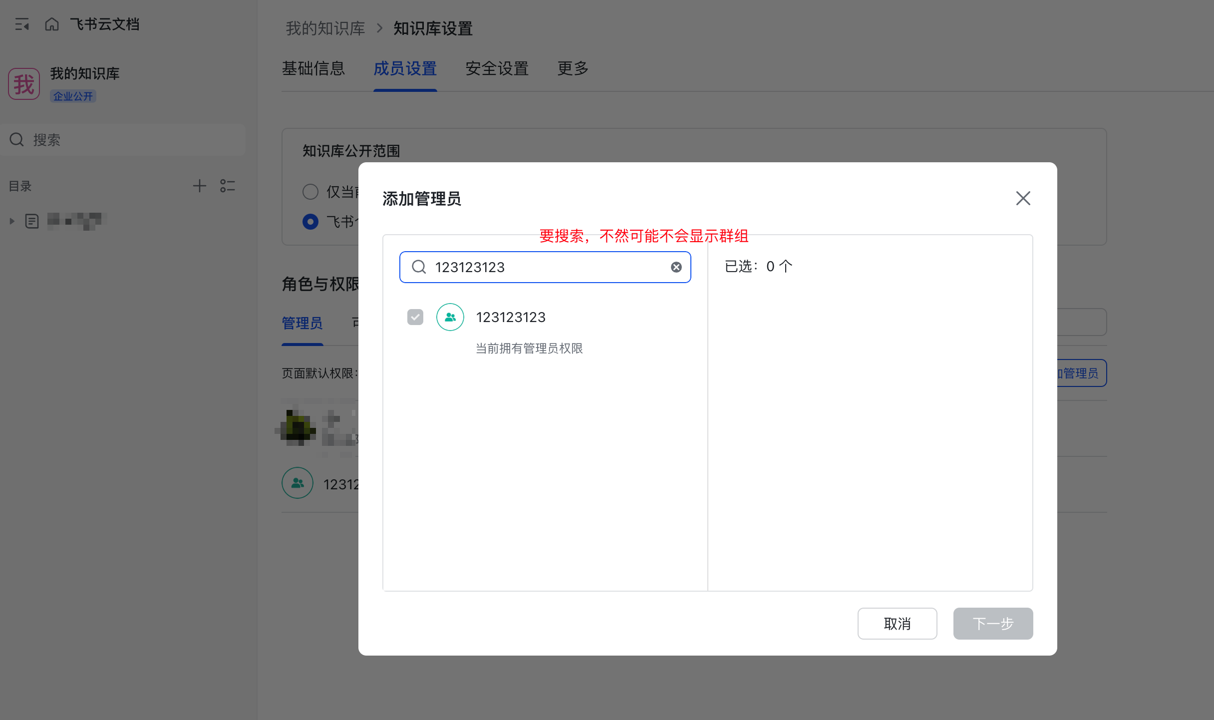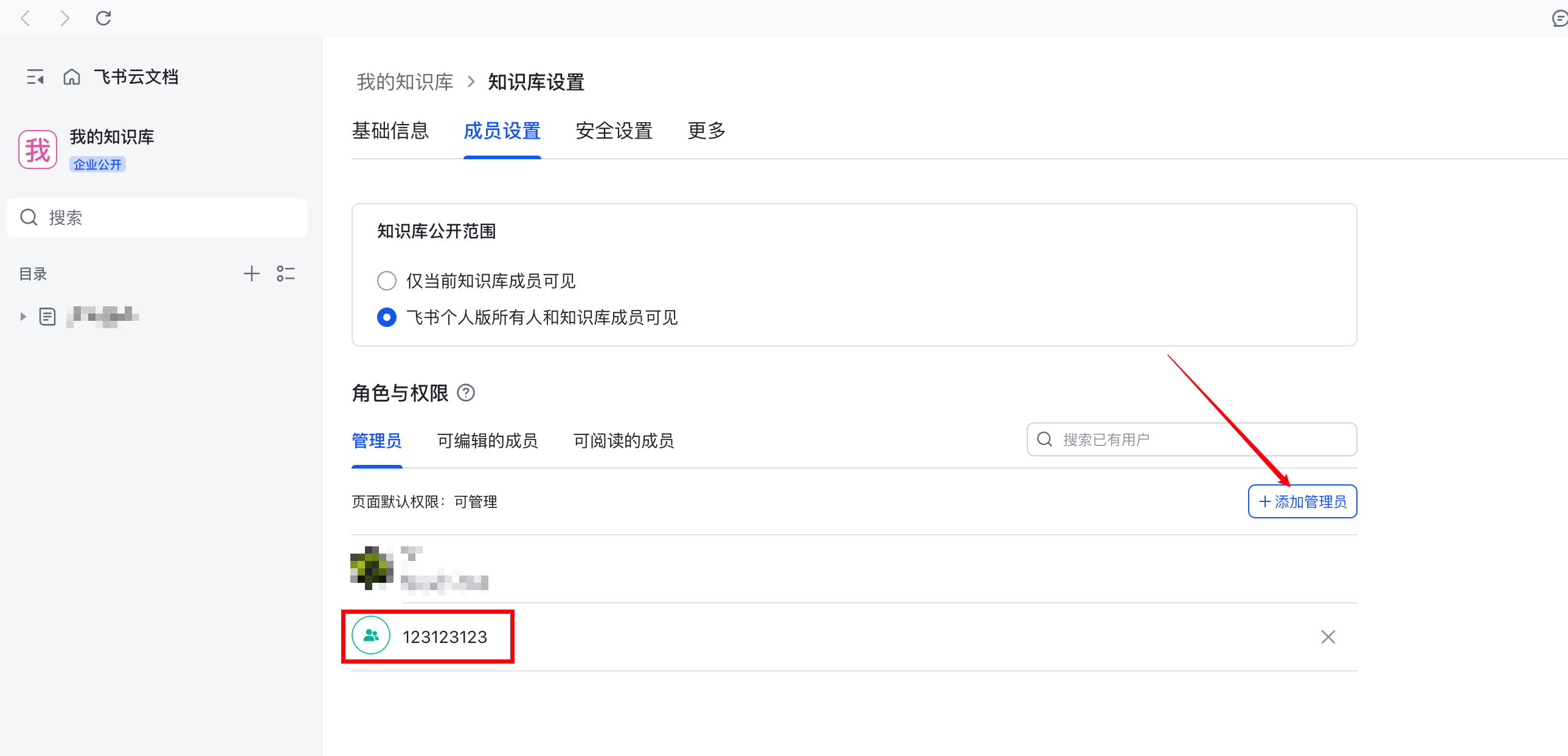 - 打开知识库,如果你是知识库管理员,则可以看见知识空间设置。打开知识空间设置>成员管理>添加管理员,选择刚刚建立的群组