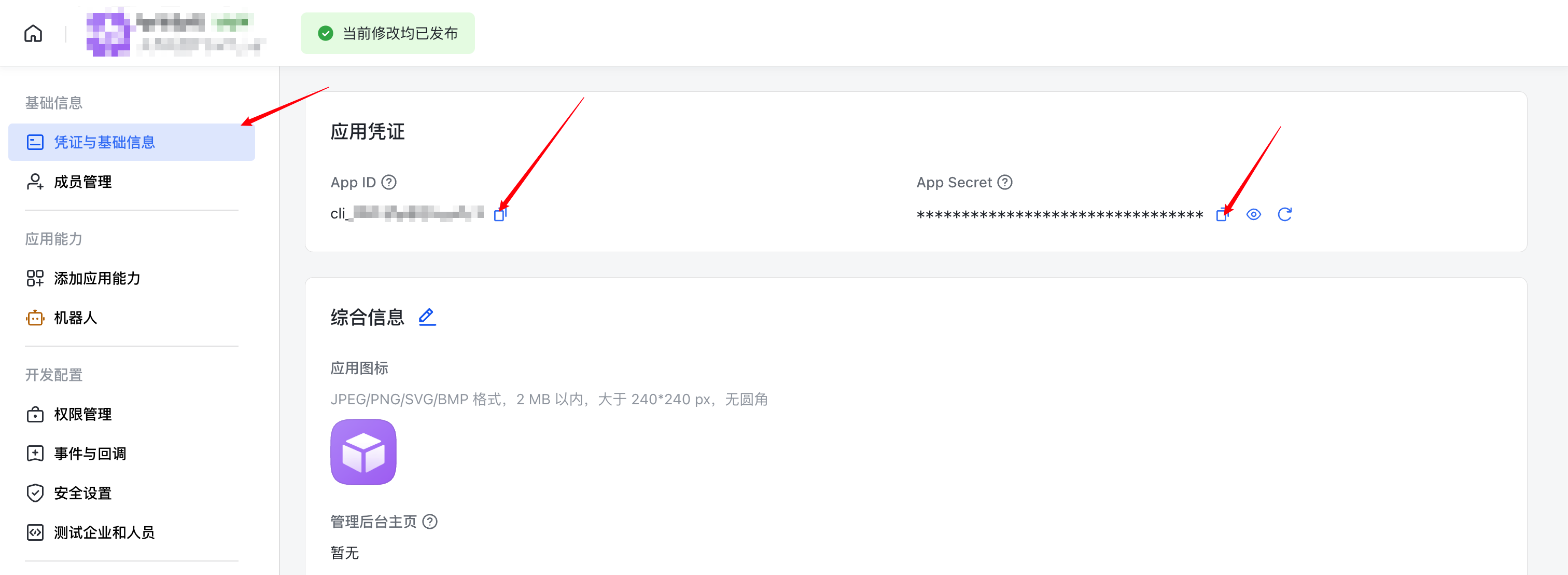 - 回到开发者平台,打开凭证与基础信息,获取