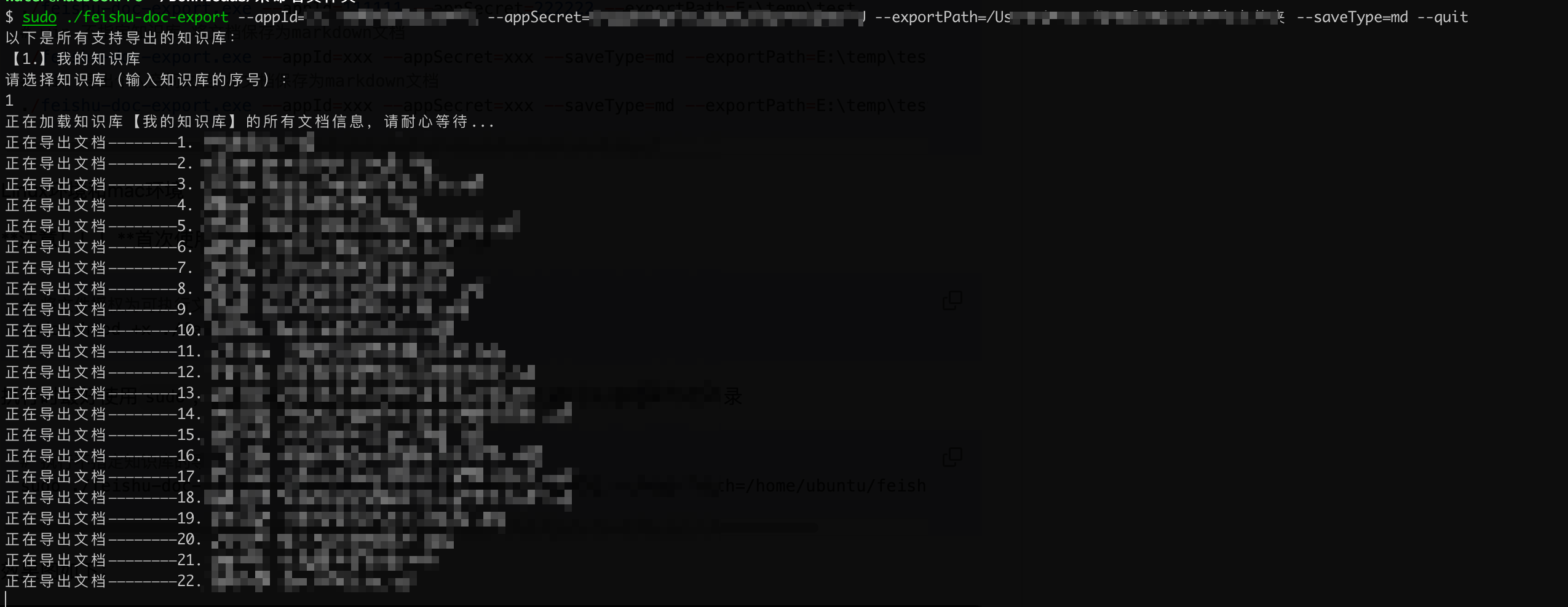 $ sudo ./feishu-doc-export --appId=XXX --appSecret=XXX --exportPath=/Users/用户名/Downloads/未命名文件夹 --saveType=md --quit
