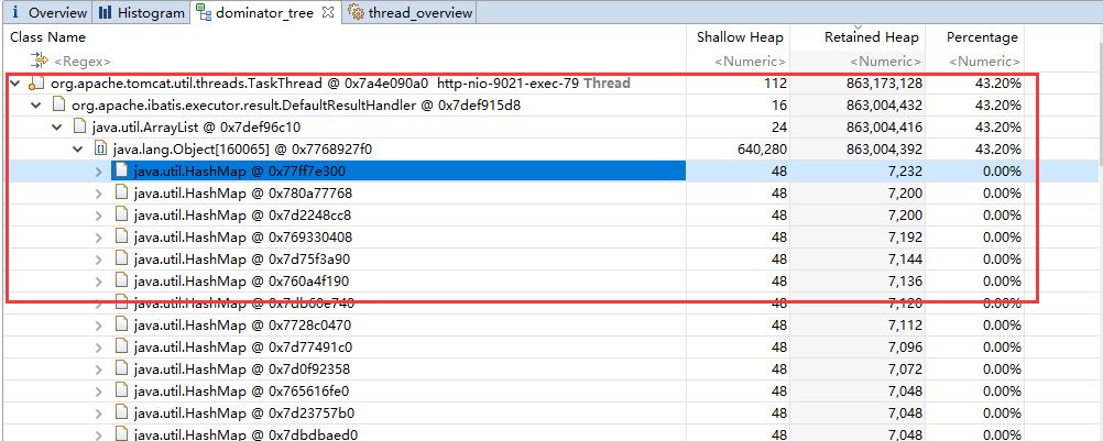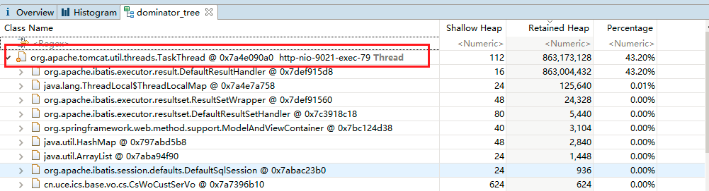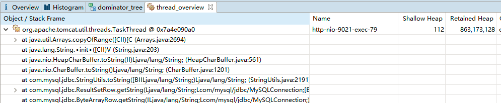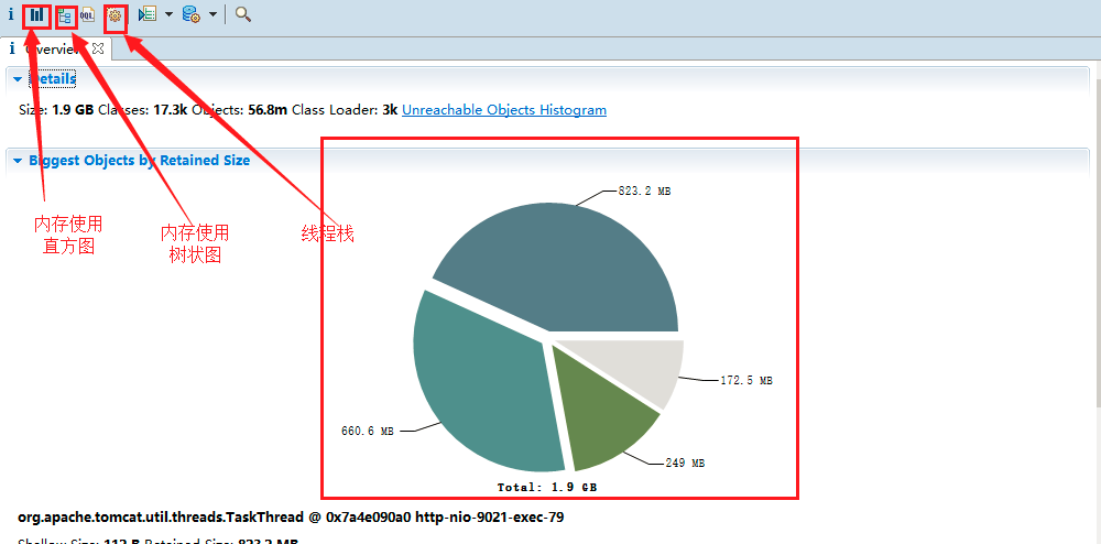 根据该图,可以明确,堆的总大小为1.9G,被4个线程全部占据,导致其他线程无法再申请资源,抛出堆内存溢出错误。