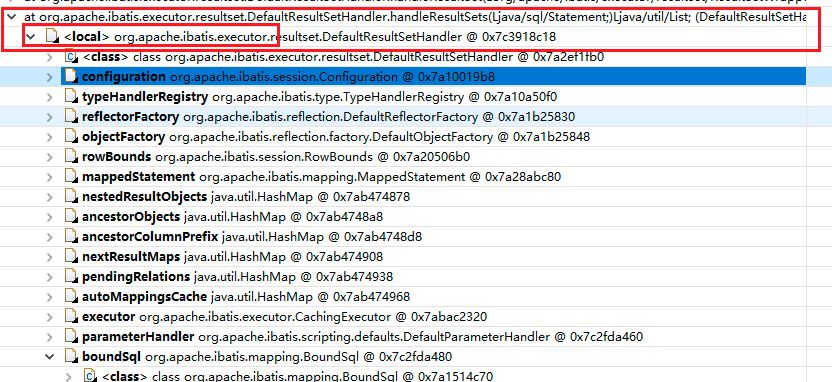 继续往上查找,要找到SQL语句,应该找到Mybatis处理结果集相关的类,如图所示: