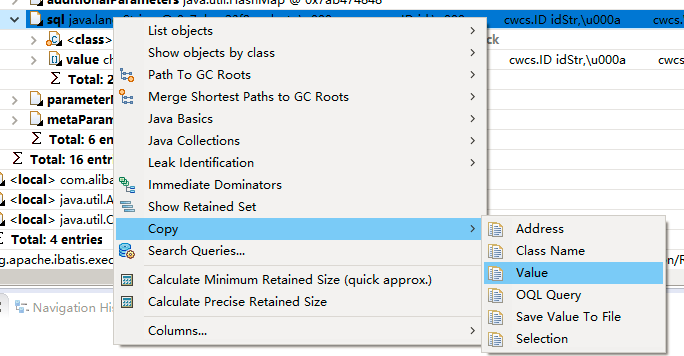 然后鼠标可以放在SQL属性中,右键,可以将SQL语句复制出来。