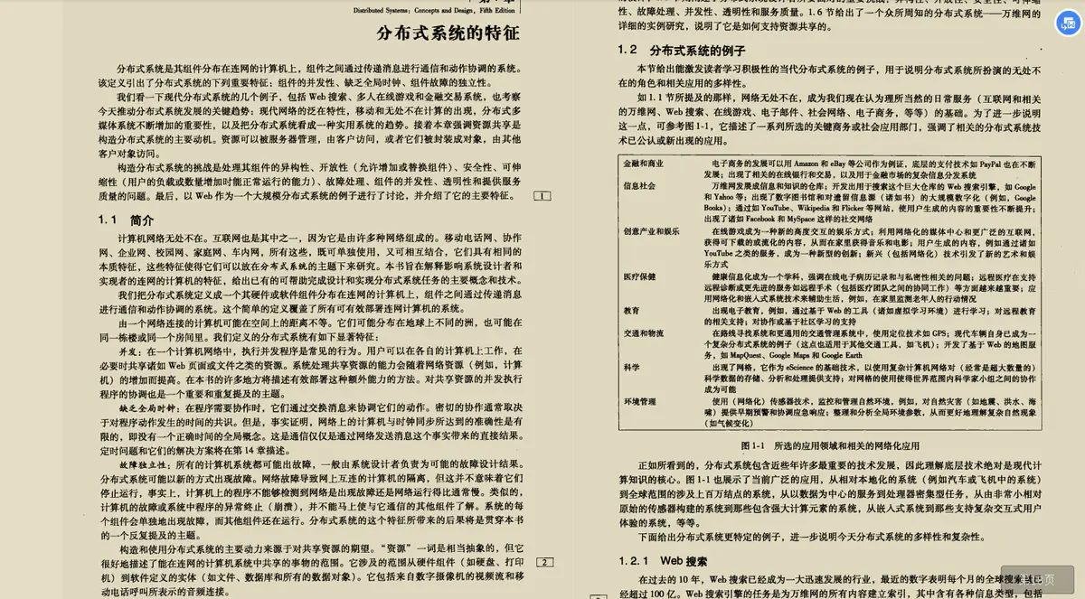 我们看一下现代分布式系统的几个例子,包括Web搜索、多人在线游戏和金融交易系统,也考察今天推动分布式系统发展的关键趋势:现代网络的泛在特性,移动和无处不在计算的出现,分布式多媒体系统不断增加的重要性,以及把分布式系统看成一-种实用系统的趋势。接着本章强调资源共享是构造分布式系统的主要动机。资源可以被服务器管理,由客户访问,或者它们被封装成对象,由其他客户对象访问。
