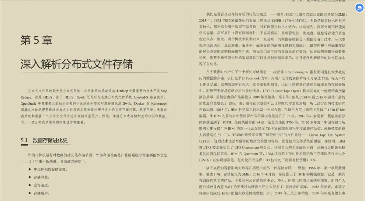 分布式文件系统是大型分布式系统中非常重要的基础设施.Hadoop中最重要的技术不是MapReduce,而是 HDFS。除了HDFS,Spark还可以与老牌分布式文件系统GlusterFS结合使用。OpenStack中最重要且能独立运营的子系统是分布式对象存储系统Swift。Docker及 Kubernetes容器技术依然需要通过分布式文件系统实现批量处理任务中的共享存储问题。更不用说,无数电商系统都需要一个分布式文件系统来存储海量照片。因此,掌握分布式存储相关的知识和技能,对于一名分布式系统架构师来说非常重要。