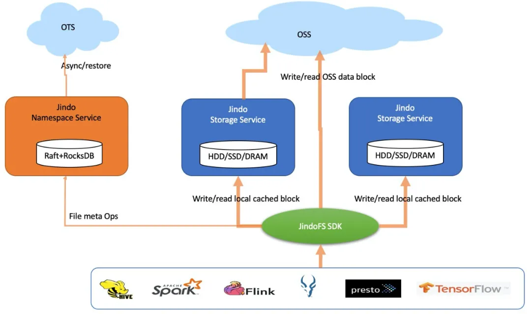 如上图示,是JindoFS在block模式下的系统架构,整体上重用了JindoFS缓存系统。在这种模式下,文件数据是分块存放在OSS上,保证可靠和可用;同时借助于本地集群上的缓存备份,可以实现缓存加速。文件元数据异步写入到阿里云OTS数据库防止本地误操作,同时方便JindoFS集群重建恢复;元数据在正常读写时走本地RocksDB,内存做LRU缓存,因此支撑的文件数在亿级;结合元数据服务的文件/目录级别细粒度锁实现,JindoFS在大规模高并发作业高峰的时候表现比HDFS更稳定,吞吐也更高。