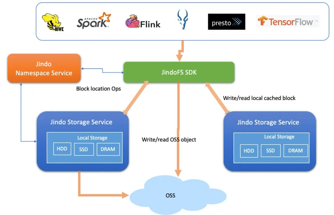 有效地保证丰富的计算对存储带宽的需求,业界早已给出的答案是计算侧的缓存。Alluxio一直在做这方面的事情,JindoFS核心定位是数据湖加速层,其思路也同出一辙。下面是它在缓存场景上的架构图。