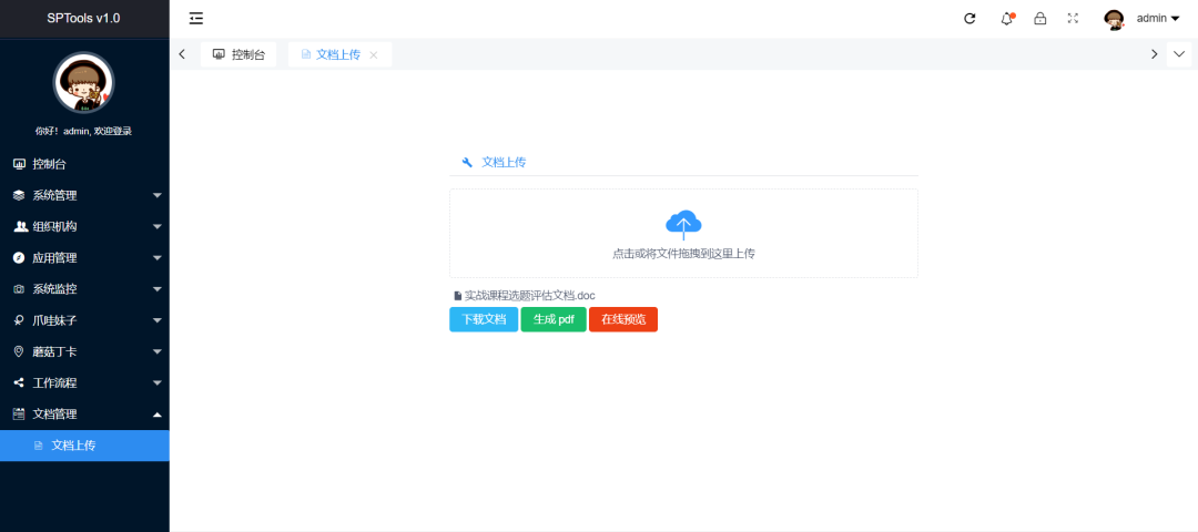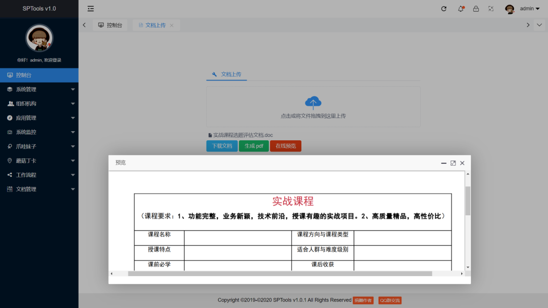 功能提供了文档上传、后台转换、前台下载、前台预览功能,小伙伴们可以上传 Excel、Word、Pdf文档,后台会默认转为Pdf文档,并可以在前台预览显示。目前只支持PC端预览,后期会配合前端插件实现多端预览。