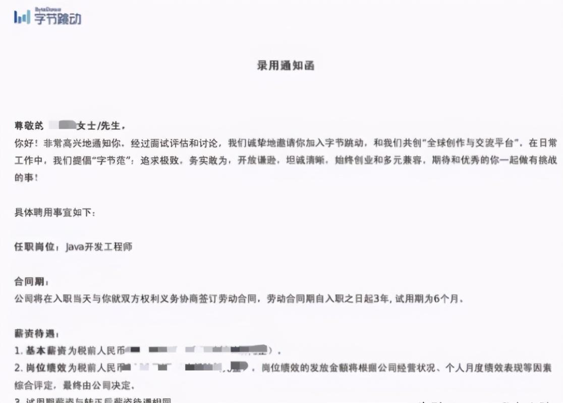 你好,非常高兴地通知你,通过了面试评估和讨论,我们诚挚地邀请你加入字节跳动......