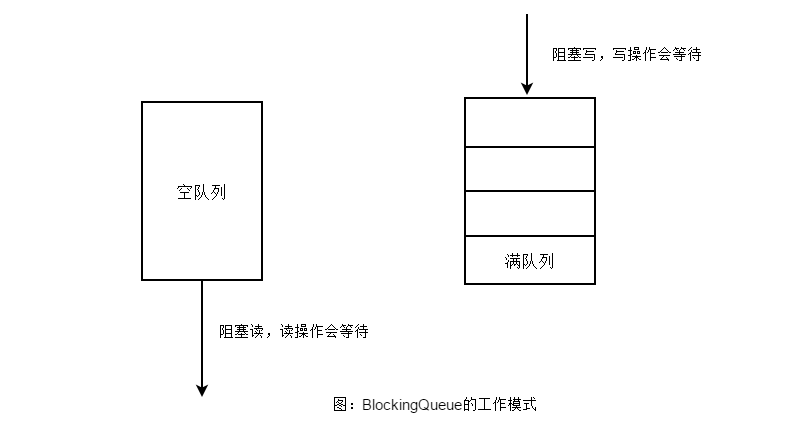 BlockingQueue 提供一种读写阻塞等待的机制,即如果消费者速度较快,则 BlockingQueue 则可能被清空,此时消费线程再试图从 BlockingQueue 读取数据时就会被阻塞。反之,如果生产线程较快,则 BlockingQueue 可能会被装满,此时,生产线程再试图向 BlockingQueue 队列装入数据时,便会被阻塞等待,其工作模式如图所示。