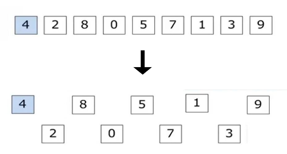 希尔排序先将元素分组(通常为总长度的一半, 例如有8个数据量, 则将数据分为4组, 每组2个数据),