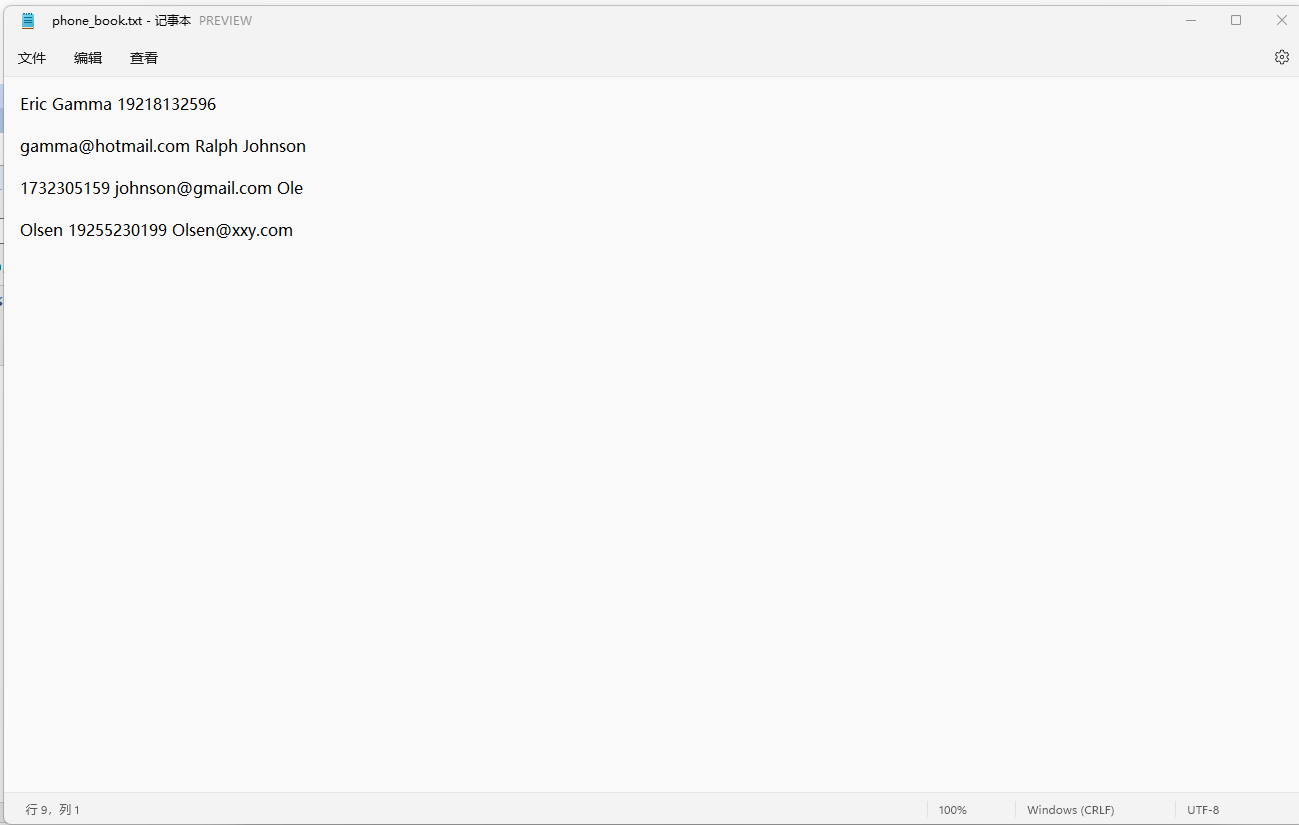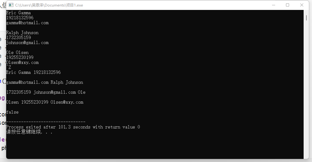 #include <iostream> #include <fstream> #include <vector> #include "Person.h" int main() { using namespace std; vector<Person> phone_book; Person p; while(cin>>p) phone_book.push_back(p); for(auto &i: phone_book) cout << i << endl; cout << boolalpha << (phone_book.at(0) == phone_book.at(1)) << endl; ofstream fout; fout.open("phone_book.txt"); if(!fout.is_open()) { cerr << "fail to open file phone_book.txt\n"; return 1; } for(auto &i: phone_book) fout << i << endl; fout.close(); }