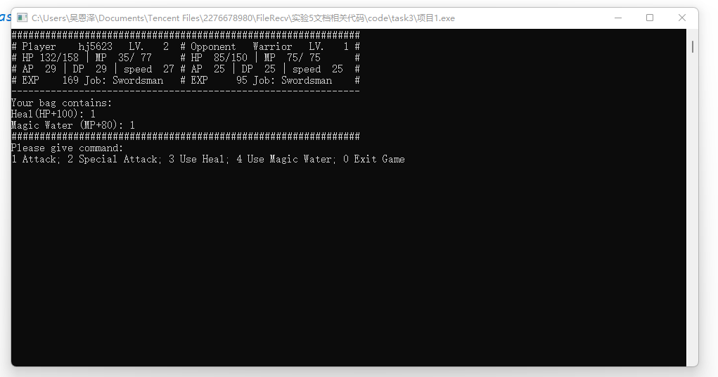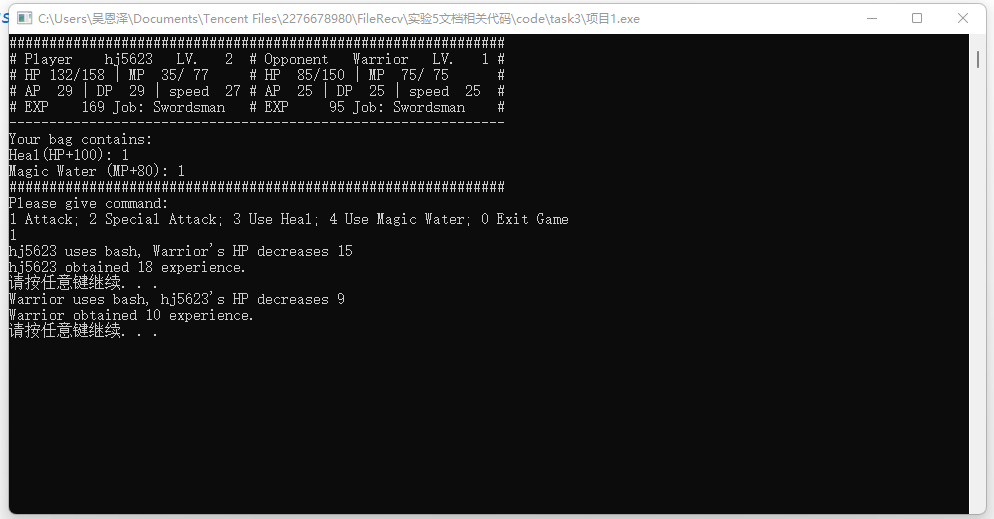 //======================= // main.cpp //======================= // main function for the RPG style game #include <iostream> #include <string> using namespace std; #include "swordsman.h" int main() { string tempName; bool success=0; //flag for storing whether operation is successful cout <<"Please input player's name: "; cin >>tempName; // get player's name from keyboard input player *human; // use pointer of base class, convenience for polymorphism int tempJob; // temp choice for job selection do { cout <<"Please choose a job: 1 Swordsman, 2 Archer, 3 Mage"<<endl; cin>>tempJob; system("cls"); // clear the screen switch(tempJob) { case 1: human=new swordsman(1,tempName); // create the character with user inputted name and job success=1; // operation succeed break; default: break; // In this case, success=0, character creation failed } }while(success!=1); // so the loop will ask user to re-create a character int tempCom; // temp command inputted by user int nOpp=0; // the Nth opponent for(int i=1;nOpp<5;i+=2) // i is opponent's level { nOpp++; system("cls"); cout<<"STAGE" <<nOpp<<endl; cout<<"Your opponent, a Level "<<i<<" Swordsman."<<endl; system("pause"); swordsman enemy(i, "Warrior"); // Initialise an opponent, level i, name "Junior" human->reFill(); // get HP/MP refill before start fight while(!human->death() && !enemy.death()) // no died { success=0; while (success!=1) { showinfo(*human,enemy); // show fighter's information cout<<"Please give command: "<<endl; cout<<"1 Attack; 2 Special Attack; 3 Use Heal; 4 Use Magic Water; 0 Exit Game"<<endl; cin>>tempCom; switch(tempCom) { case 0: cout<<"Are you sure to exit? Y/N"<<endl; char temp; cin>>temp; if(temp=='Y'||temp=='y') return 0; else break; case 1: success=human->attack(enemy); human->isLevelUp(); enemy.isDead(); break; case 2: success=human->specialatt(enemy); human->isLevelUp(); enemy.isDead(); break; case 3: success=human->useHeal(); break; case 4: success=human->useMW(); break; default: break; } } if(!enemy.death()) // If AI still alive enemy.AI(*human); else // AI died { cout<<"YOU WIN"<<endl; human->transfer(enemy); // player got all AI's items } if (human->death()) { system("cls"); cout<<endl<<setw(50)<<"GAME OVER"<<endl; delete human; // player is dead, program is getting to its end, what should we do here? system("pause"); return 0; } } } delete human; // You win, program is getting to its end, what should we do here? system("cls"); cout<<"Congratulations! You defeated all opponents!!"<<endl; system("pause"); return 0; }