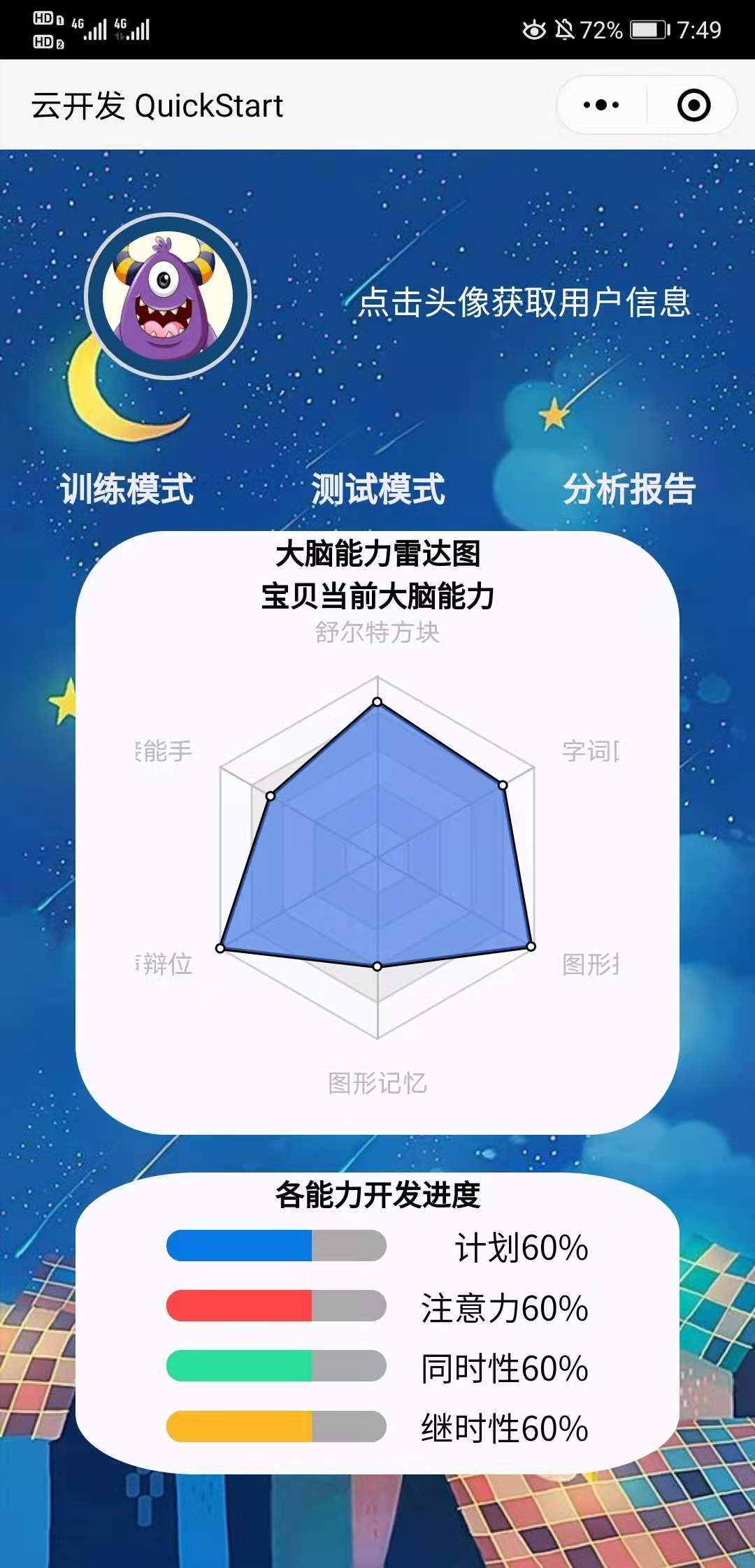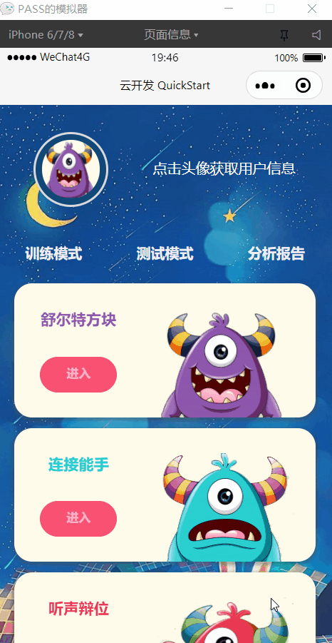 主页主要包括了3个部分,训练模式,测试模式,分析报告,用户可以在训练模式进行训练,训练得分不计入成绩,测试模式用于测试用户的水平,分析报告根据用户测试的情况给出分析报告。