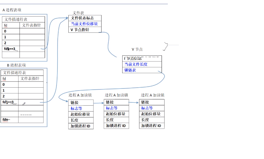 2)文件锁:进程共享文件锁链表,通过检查链表上的锁节点,从而知道自己能不能操作