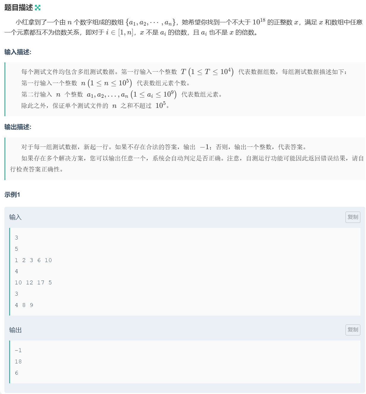这题考察素数。由题目得,ai不超过1e9,因此如果给的数有1就输入-1(1和任何数都构成倍数关系),否则输出任意一个比1e9大的素数、